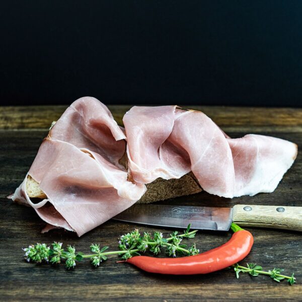 Zutaten: Schweineschlögl, Wasser, Kochsalz (Konservierungsstoff: Natriumnitrit), Antioxidationsmittel: Natriumascorbat, Geschmacksverstärker: Mononatriumglutamat, Gewürze, Dextrose