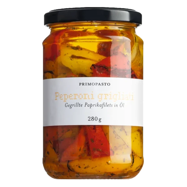 Rote und gelbe Paprikafilets von fleischiger Konsistenz, gegrillt und in Sonnenblumenöl eingelegt. Für Vorspeisenteller, als Beilage zu gekochtem Fleisch, zum Zubereiten von Gemüsefarce, für Salate oder zur Bagna cauda, der warmen Piemonteser Sardellensauce.