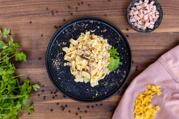 Zutaten: Trüffelschinken (Schweinefleisch, Kochsalz (Konservierungsstoff: Natriumnitrit), Antioxidationsmittel: Natriumascorbat, Stabilisator: Triphosphate, Dextrose, Trüffel, Gewürze), SCHLAGOBERS, Fleckerl 20% (HARTWEIZENGRIESS, EIER), Wasser, Zwiebel, Zucchini, BUTTER, Trüffel, Grana Padano (MILCH, Salz, Lab, Lysozym aus EI), Gewürze