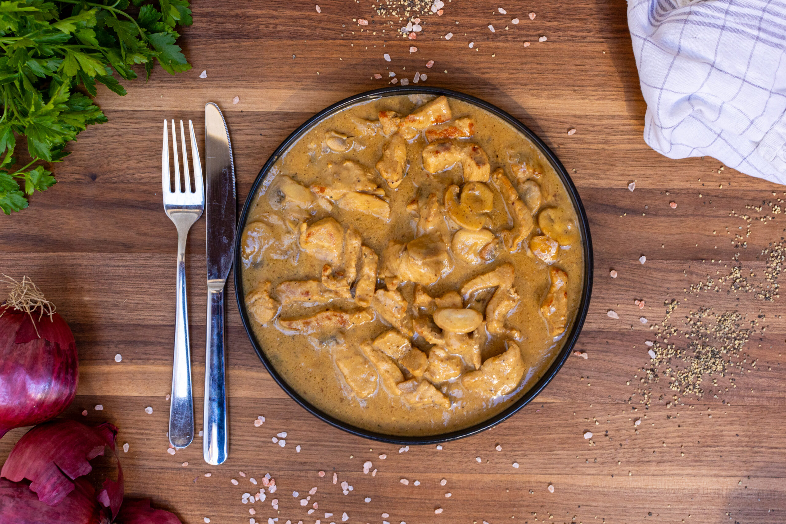 Zutaten: Kalbfleisch 55%, Zwiebel, Suppe (Wasser, Rindfleisch, Rindsknochen, Salz, Karotten, gelbe Rüben, SELLERIE), Bratensaft (Schweinsknochen, Wasser), SCHLAGOBERS, Stärke (WEIZEN), Salz, Gewürze
