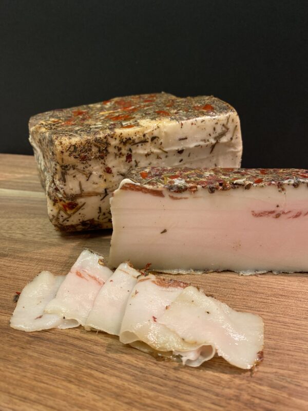 Diese Umbrische Spezialität wird 6 Monate lang in feinsten Gewürzen gereift. Für die feine Note sorgen Salz, Essig, Pfeffer, Knoblauch und Rosmarin.