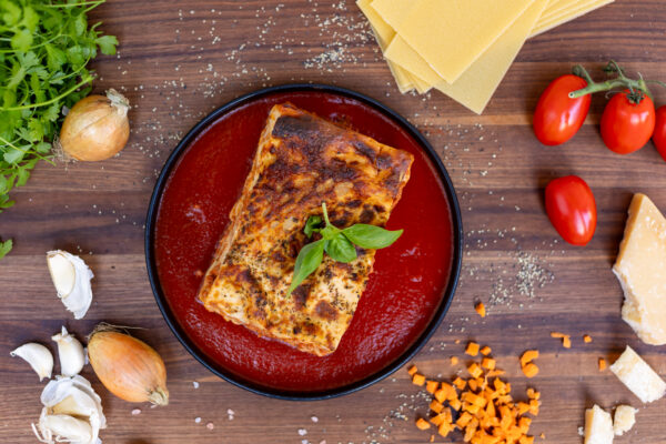 Zutaten: Lasagneblätter (HARTWEIZENGRIESS), Sauce Bolognese (Tomatensauce: (Wasser, Öl, WEIZENMEHL, Paprika, Tomatenmark, Salz, Gewürze), Schweinefleisch, Zwiebel, Tomatenmark, Karotten, Salz, Gewürze), Bechamel (MILCH, BUTTER, WEIZENMEHL, Gewürze)