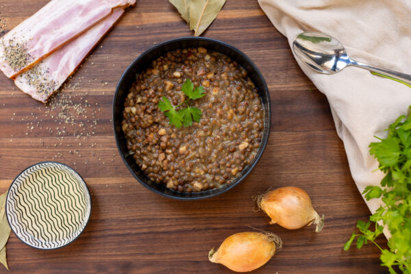 Zutaten: Linsen 68%, Speck 19% (Bauchfleisch, Kochsalz (Konservierungsstoff: Natriumnitrit)), Wasser, Zwiebel, WEIZENMEHL, Weingeistessig, Salz, Gewürze