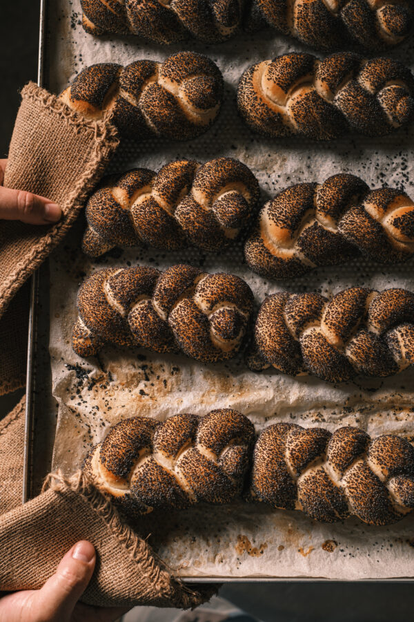 Per Hand verflochten und in Blaumohn getunkt, zart knusprig mit Mohngeruch der einen leicht nussigen Geschmack verleiht.