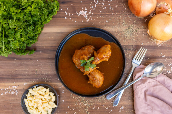 Zutaten: Hühnerkeule 55%, Zwiebel, Wasser, Bratenfett (Schweinsknochen, Wasser), Paprika 2,5%, WEIZENMEHL, Salz, Gewürze