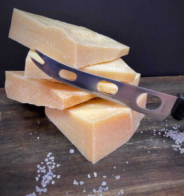 Für einen ganzen Laib dieses Parmesans benötigt man 500 Liter Milch. Die Rinder dürfen nur auf den besten, artenreichsten Wiesen weiden, Silage und vergorenes Futter sind streng verboten.