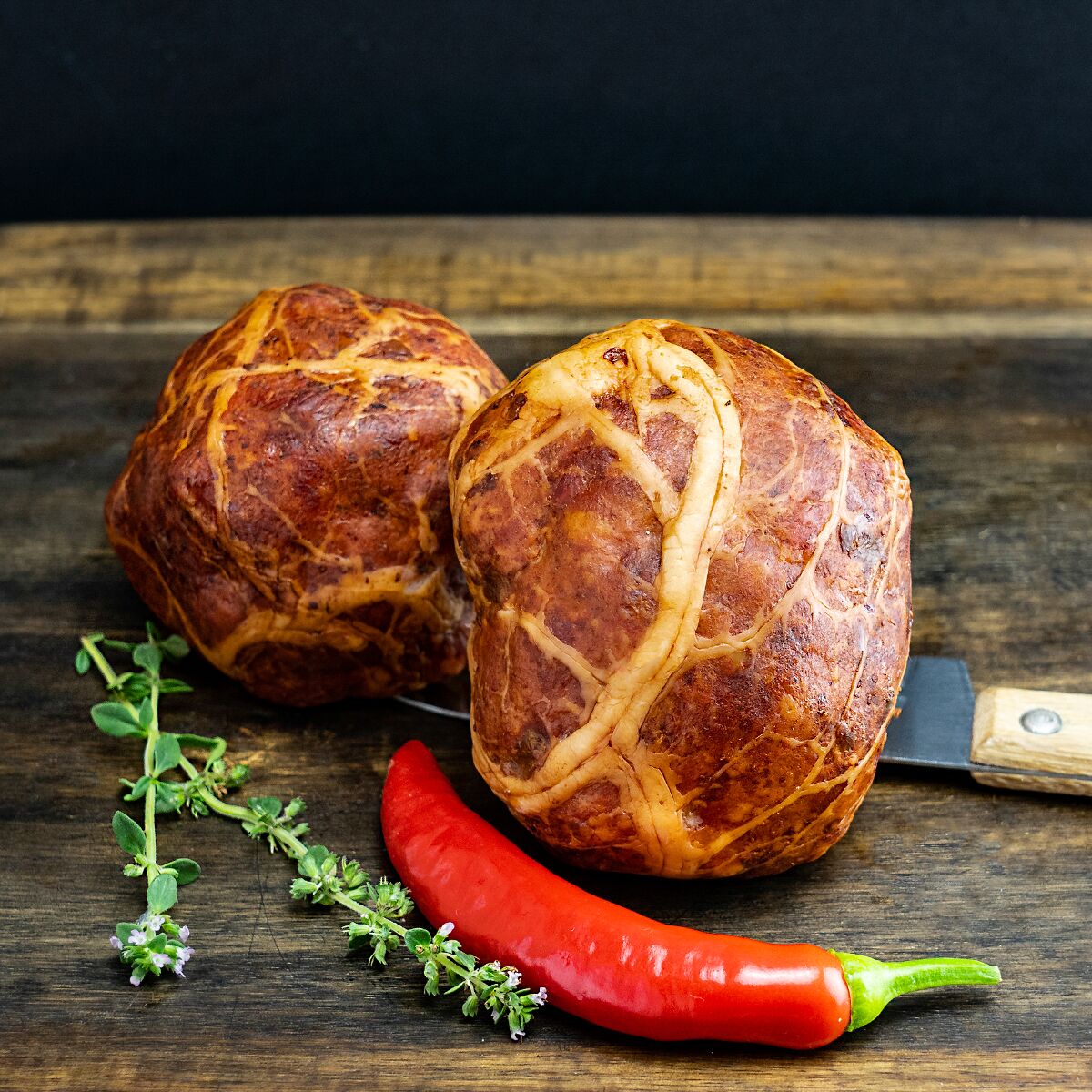 Zutaten: Schweinefleisch, Rindfleisch, Kochsalz (Konservierungsstoff: Natriumnitrit), Antioxidationsmittel: Natriumascorbat, Stabilisator: Di- und Triphosphate, Schweinsnetz, Gewürze