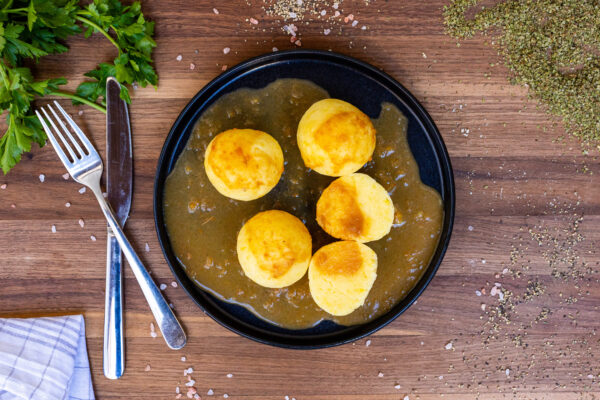Lockere, fein gewürzte Leberknödel aus eigener Herstellung. Ideal für kräftige Suppen oder als Hauptgericht. Typisch Wiener Hausmannskost von der Fleischerei Gissinger.